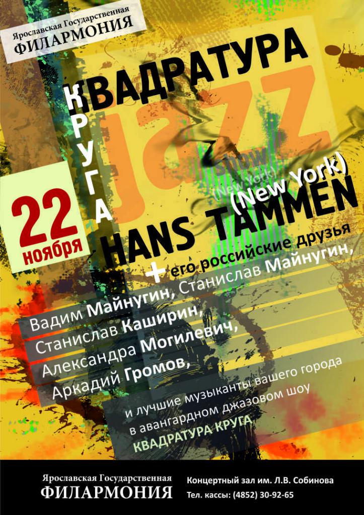 With Stasik Mainugin (ts ss melodica), Stasik Kashirin (g), Vadim Mainugin (kb), Sergey Kuznetsov (harmonica), Alexander Satkov (tb), Alexander Sakurov (ts, Ivanovo only), Arkadij Gromov (b) and Alexandra Mogilevich (dr), Hans Tammen – concept, composition, conducting.
